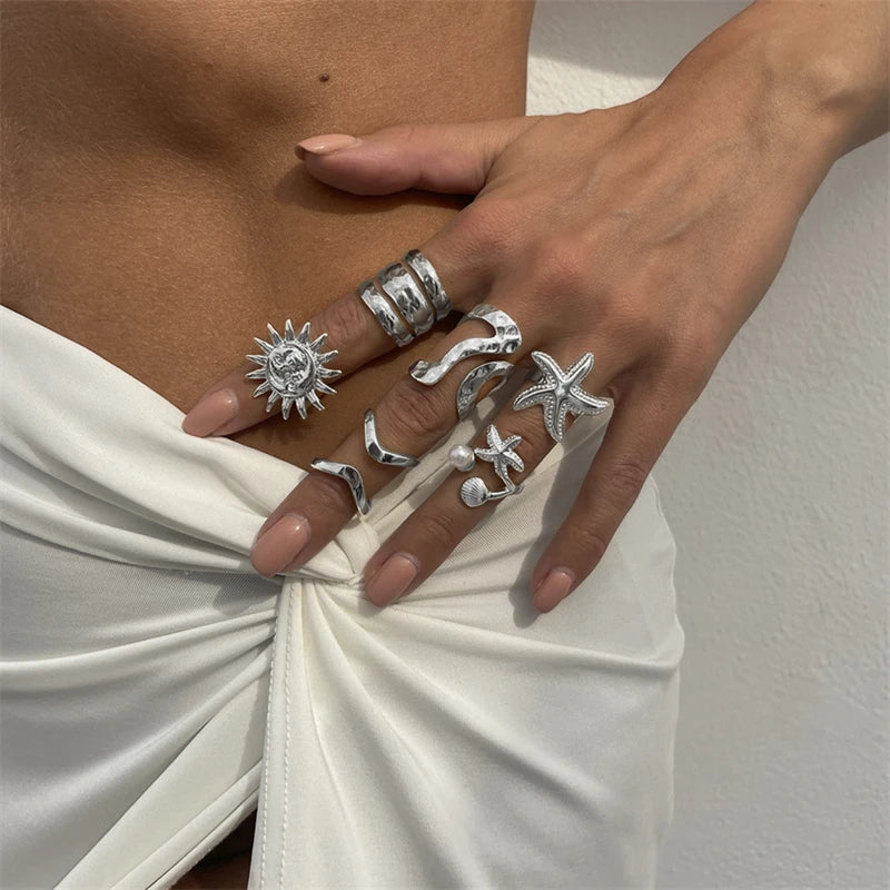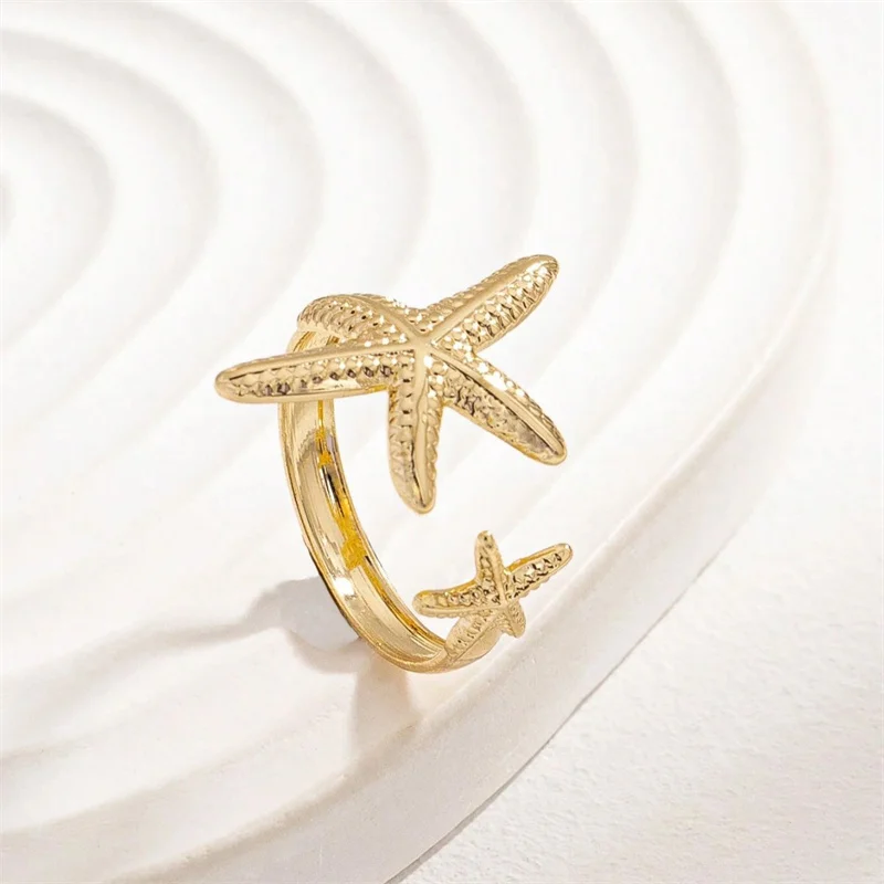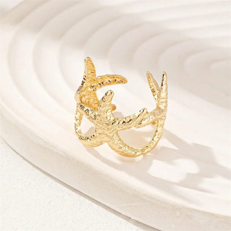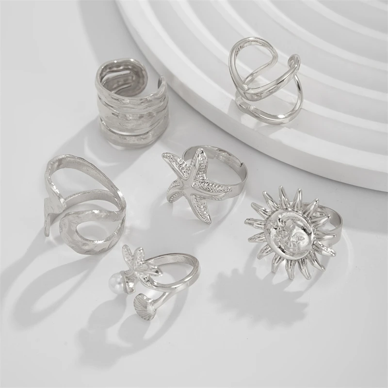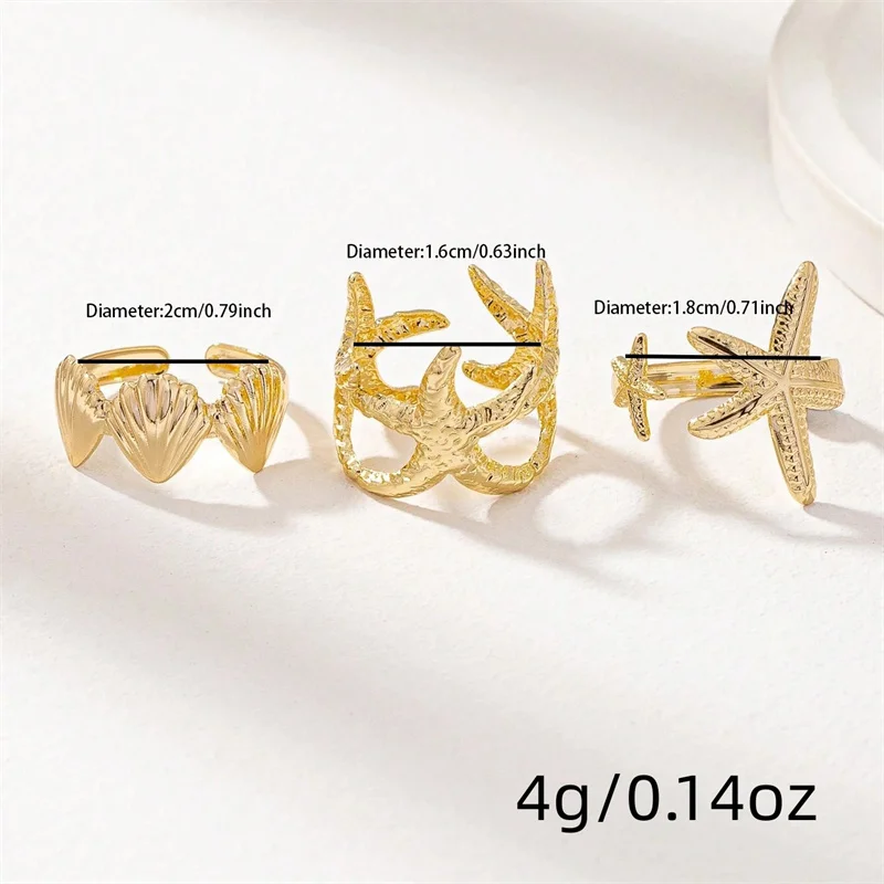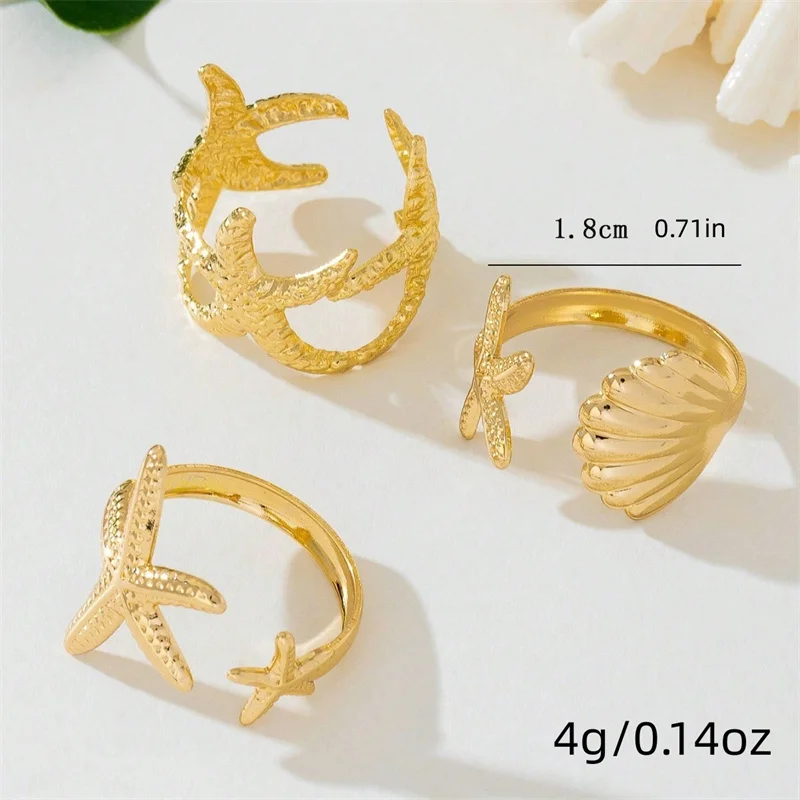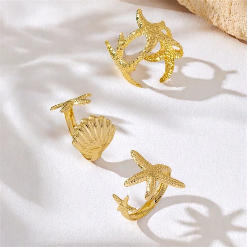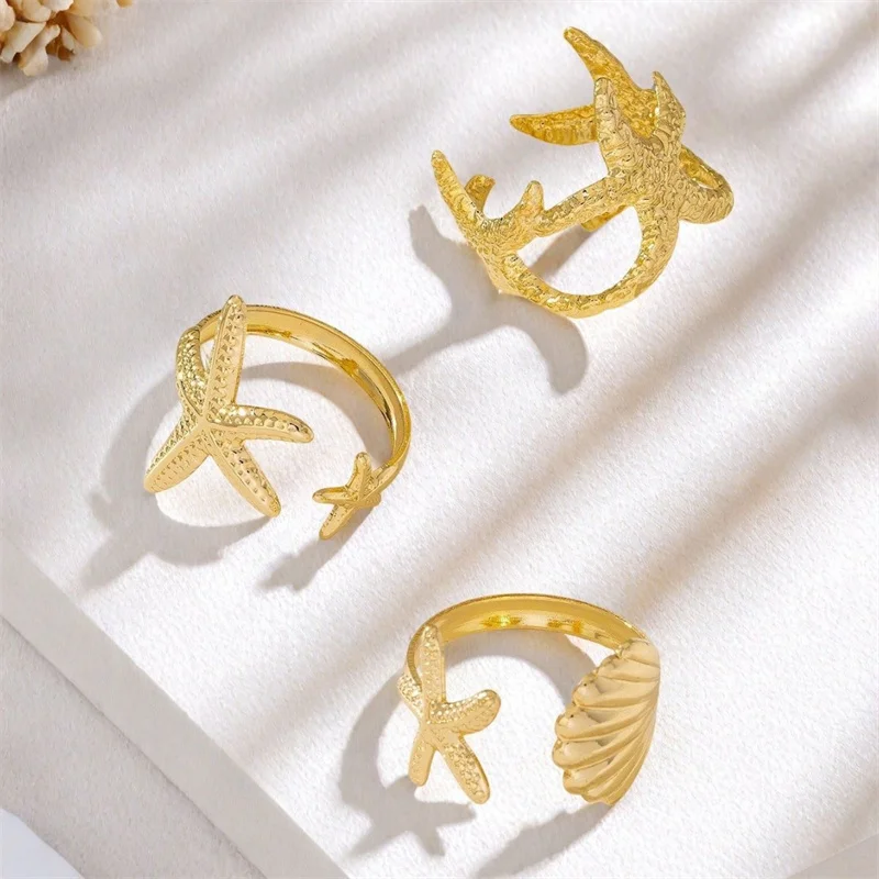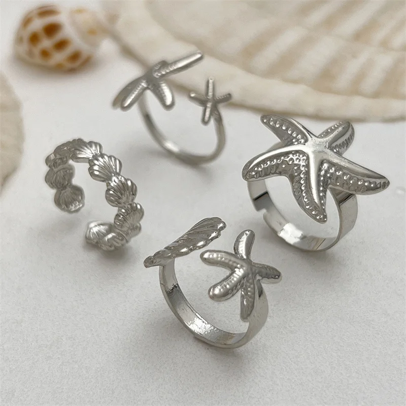 Includes 4 unique rings with starfish, shell, and irregular geometric designs