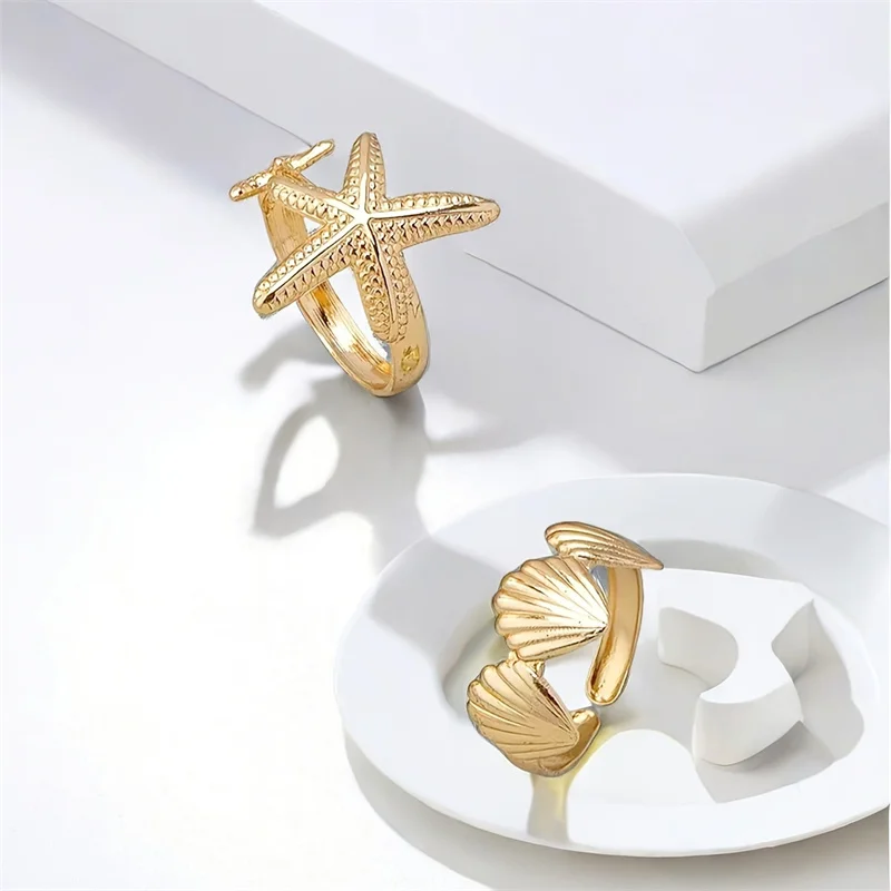 Get summer-ready with this stylish set of 4 open rings featuring starfish and shell designs — perfect for beach parties and adding a touch of seaside charm to your look.