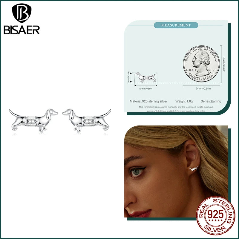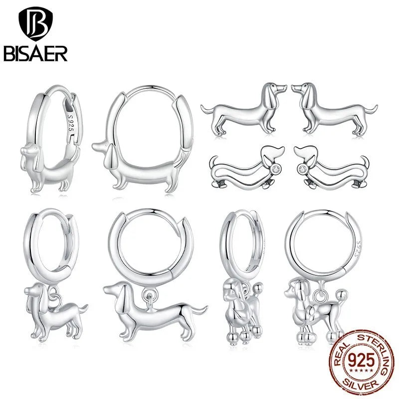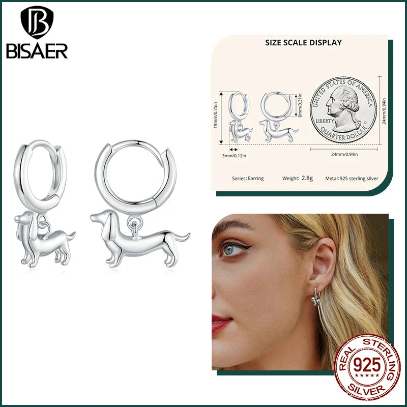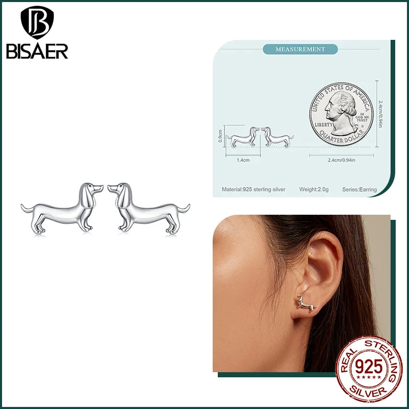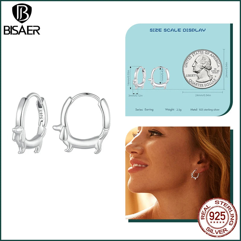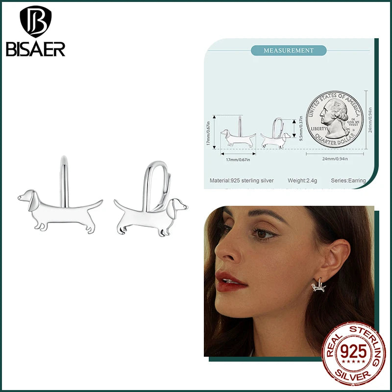 BISAER 925 Sterling Silver Cute Dachshund Ear Buckles – Hypoallergenic Animal Huggie Earrings for Women