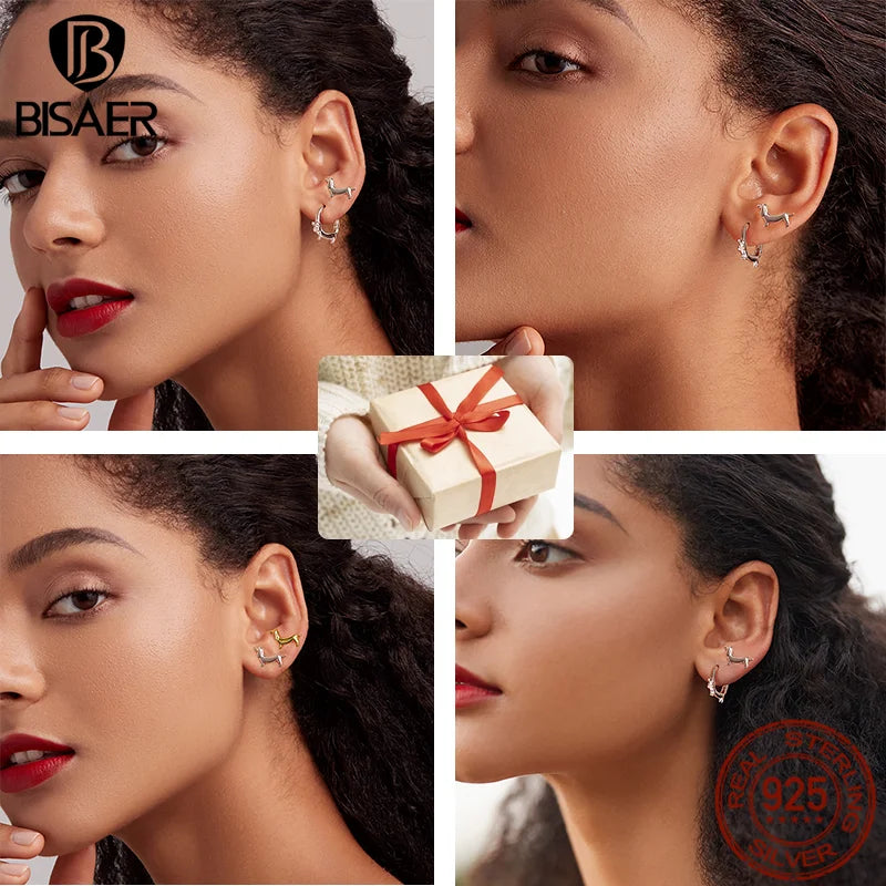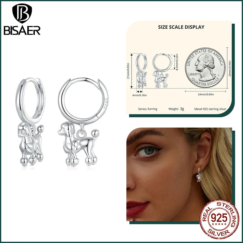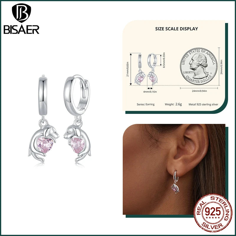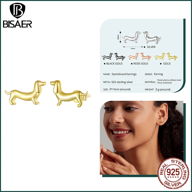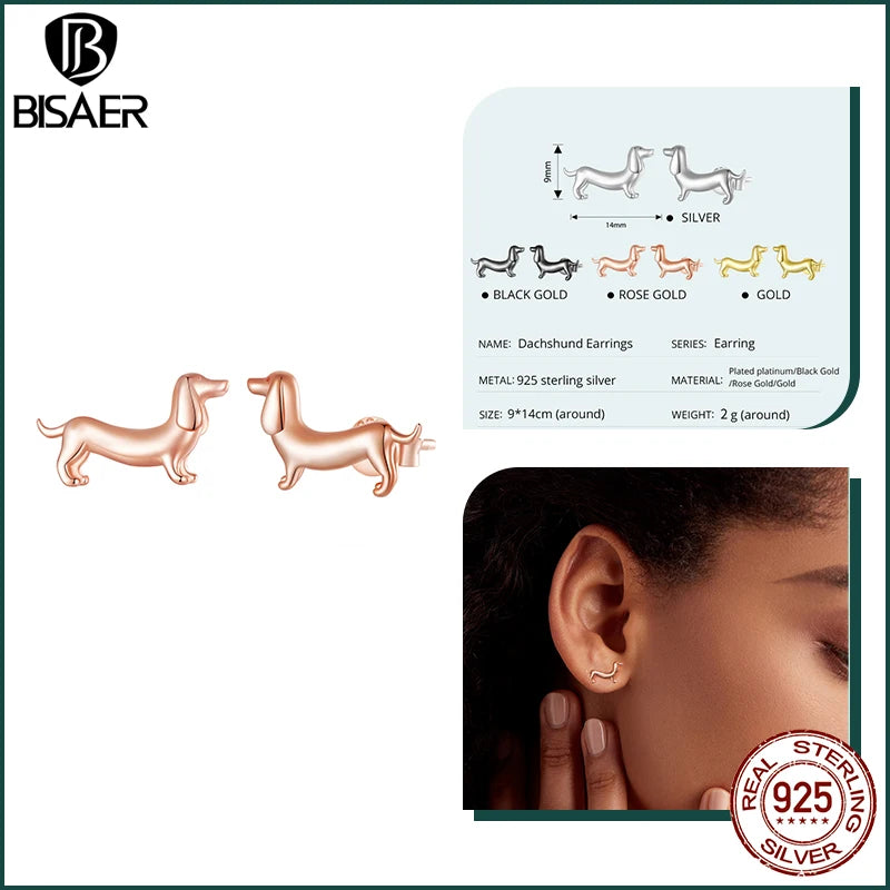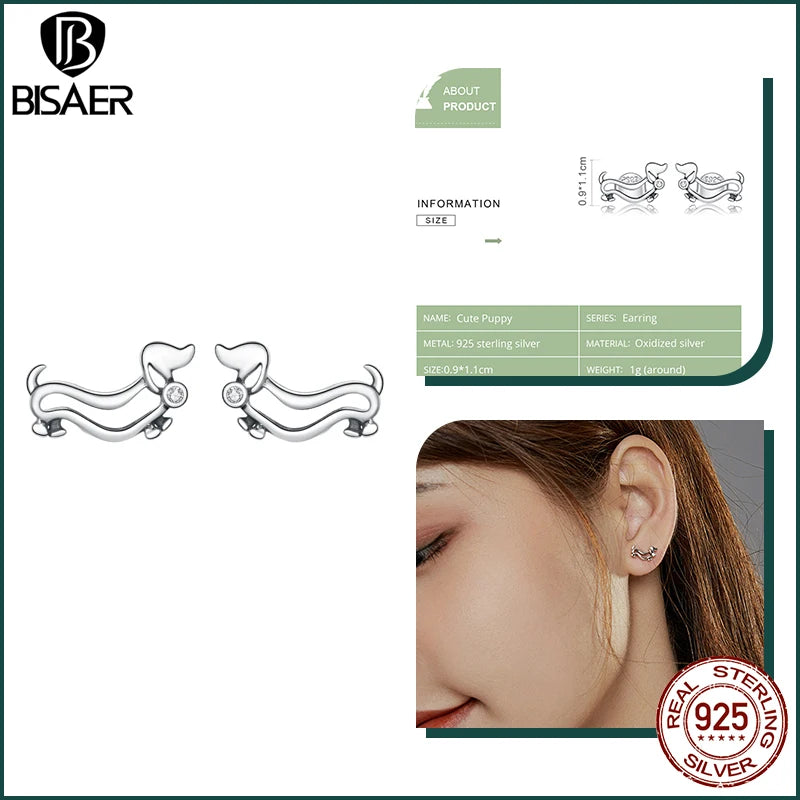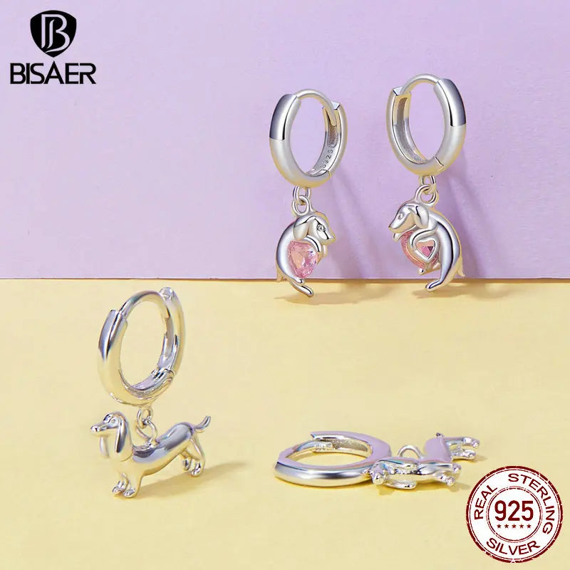 BISAER 925 Sterling Silver Cute Dachshund Ear Buckles – Hypoallergenic Animal Huggie Earrings for Women