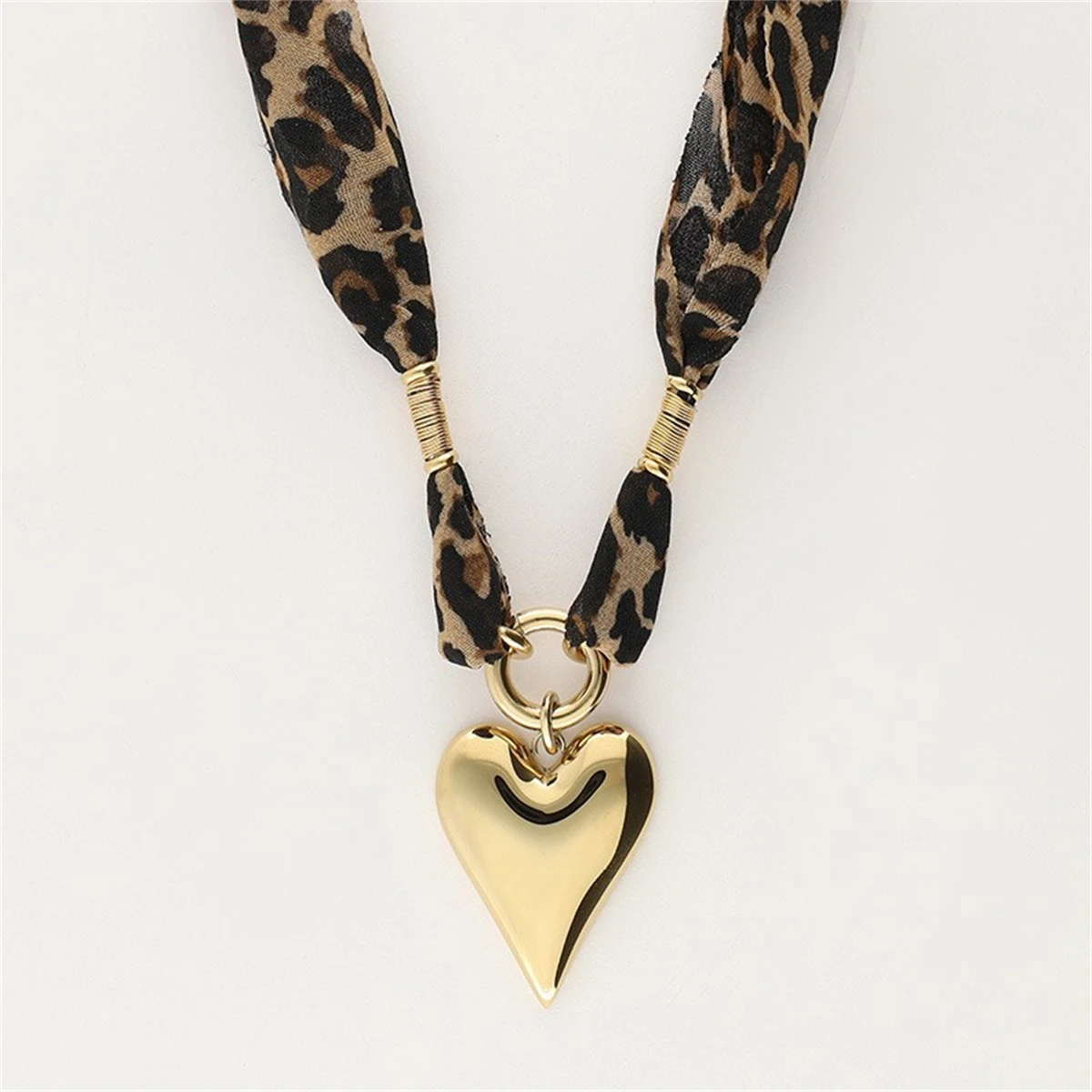 Geometric Heart Leopard Print Scarf Necklace – Gold-Plated Stainless Steel Trendy Jewelry