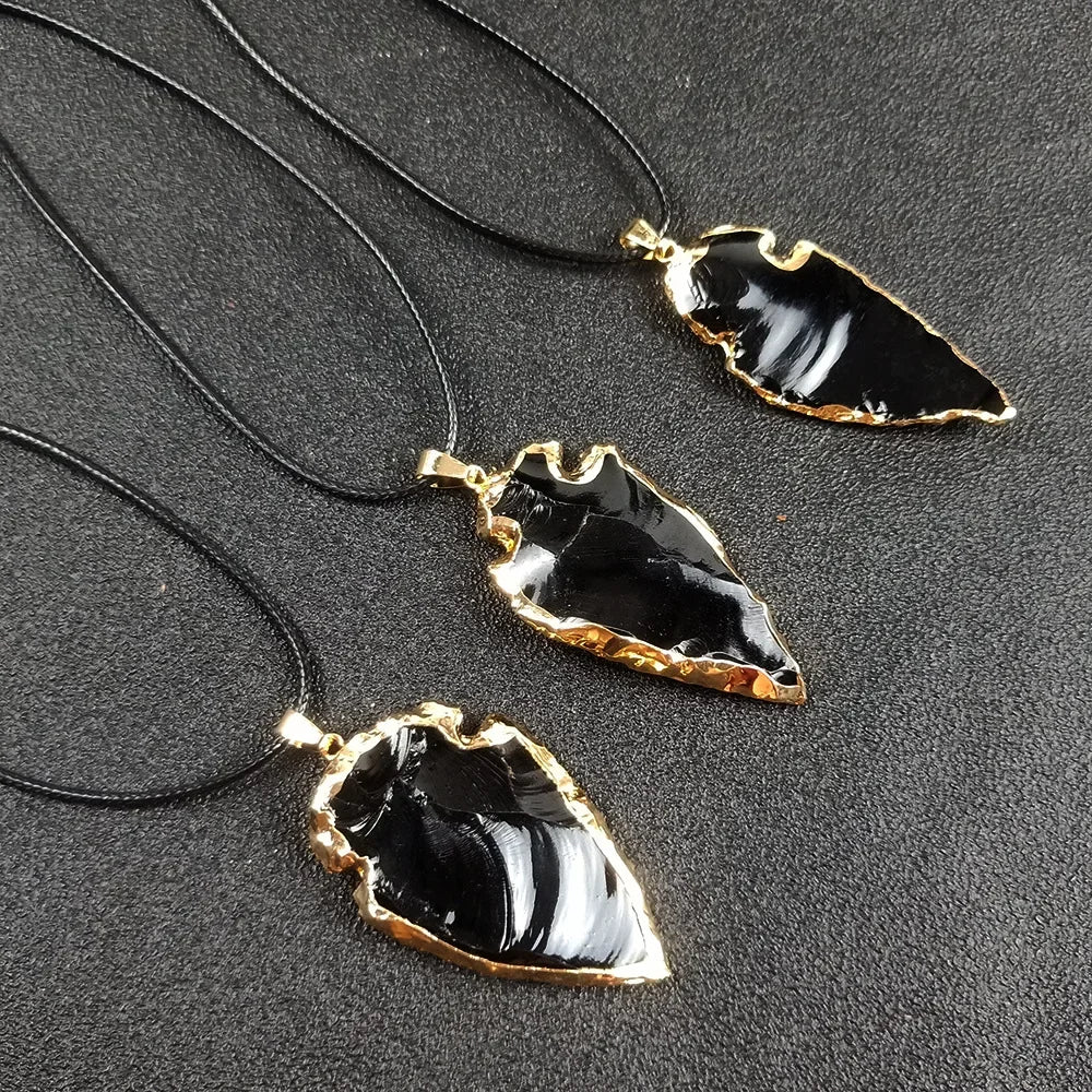 Genuine natural black obsidian crystal with a rough-cut arrowhead shape and durable necklace cord.