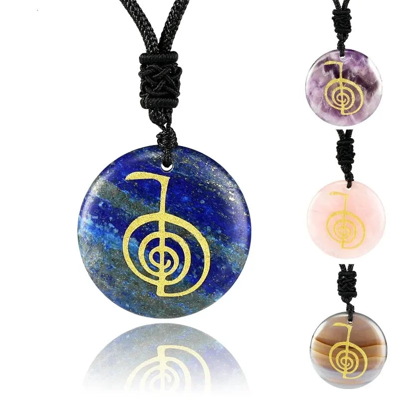 Enhance your energy and style with this natural chakra pendant necklace featuring lapis lazuli, quartz, and amethyst stones. Adorned with the Cho Ku Rei Reiki symbol, it’s designed for spiritual healing and balance.