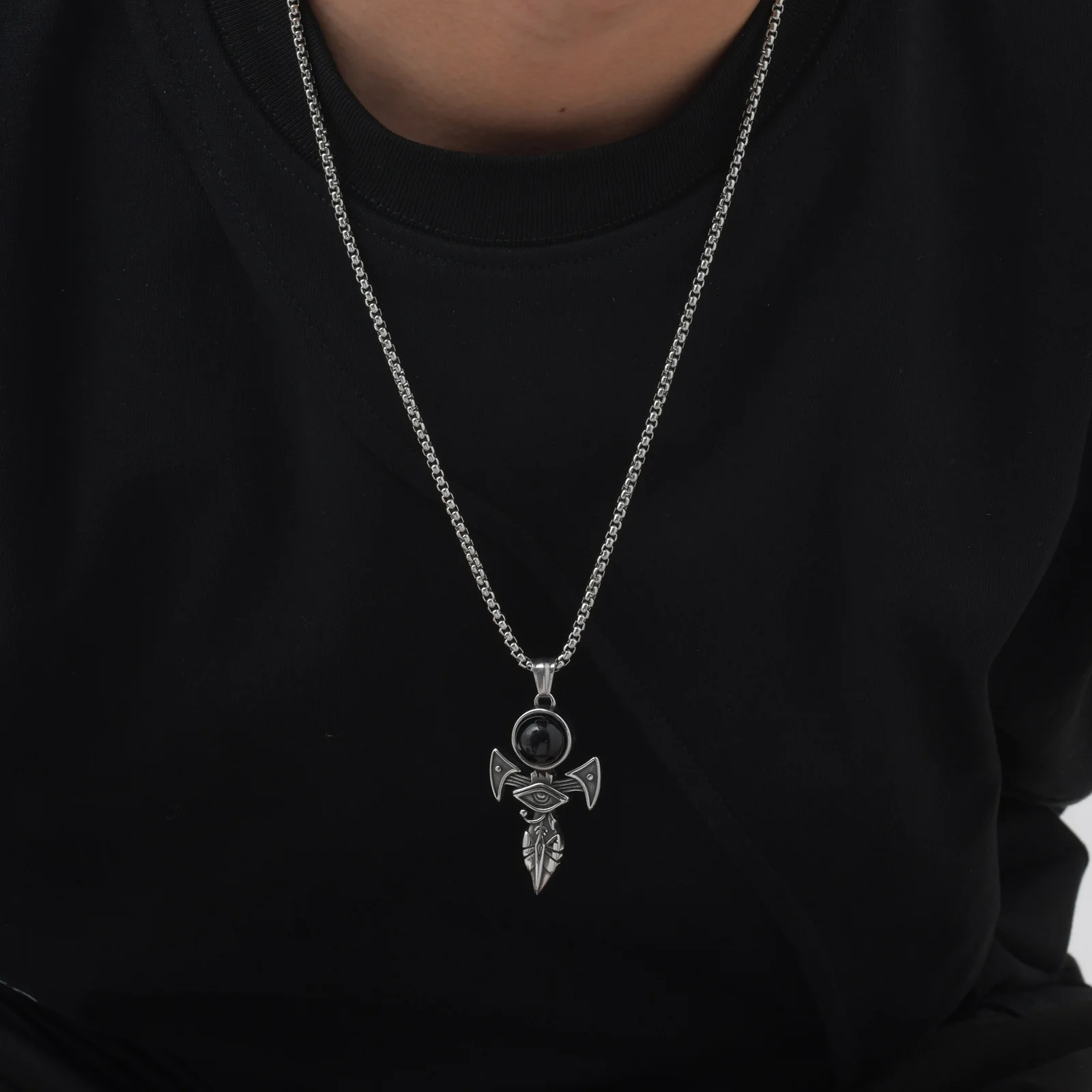 Unleash bold energy and ancient power with this Agate Horus Eye Necklace for men. Featuring a striking black onyx agate cross pendant engraved with the Eye of Horus, this piece fuses spiritual symbolism with rock and punk-inspired vintage style.
