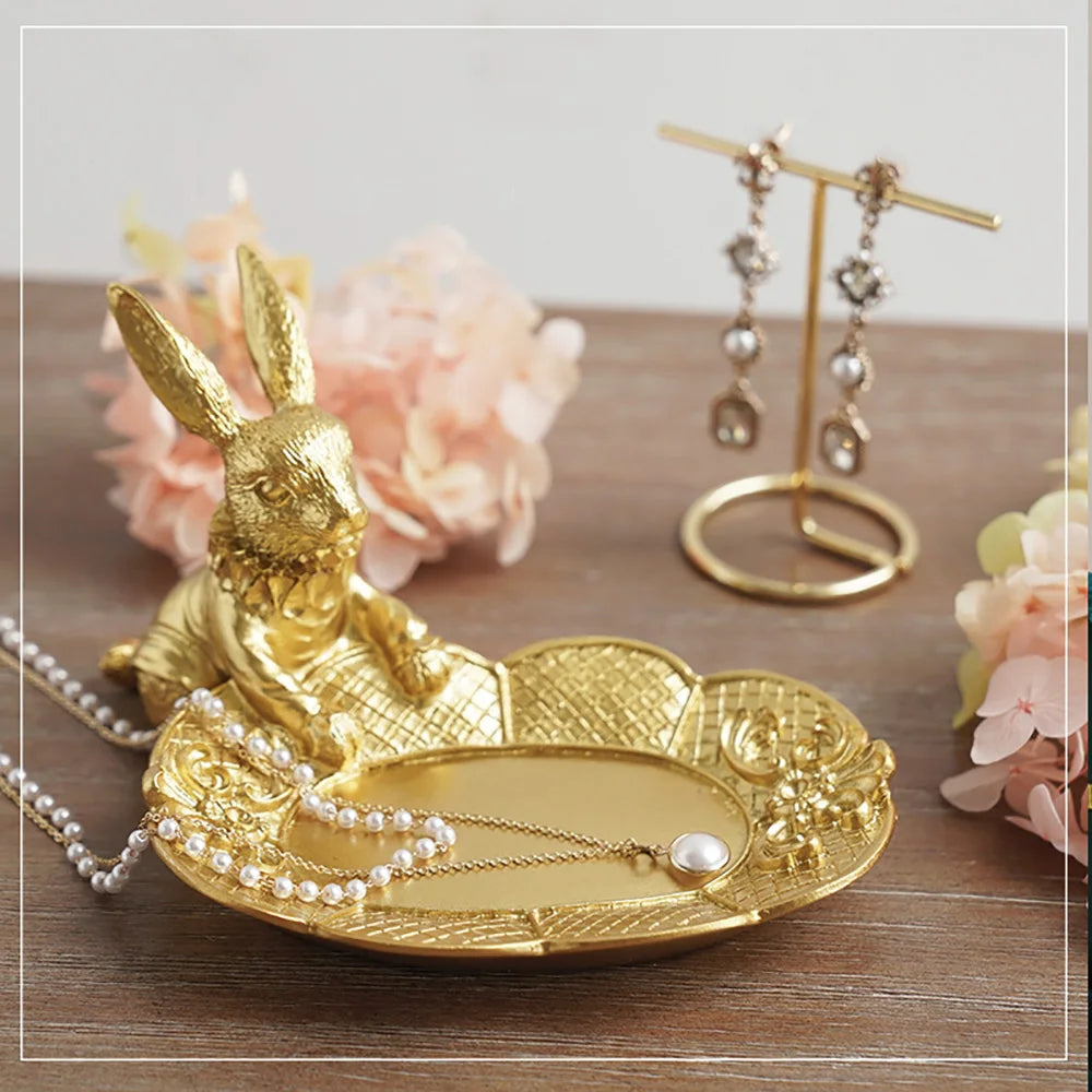 Bring a touch of whimsy and elegance to your space — order your golden bunny ring tray today!