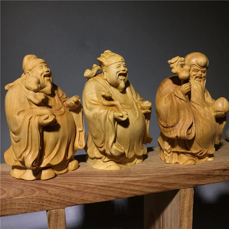 Solid Wood Fu Lu Shou Character Ornament – Hand-Carved Decorative Statue 3-Piece Set