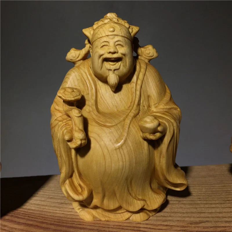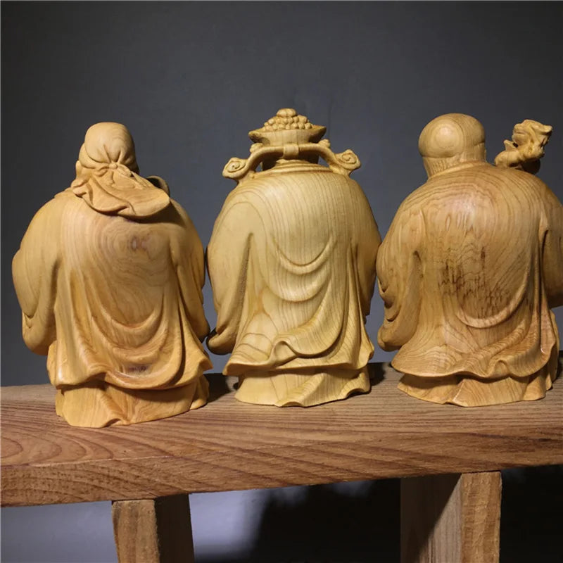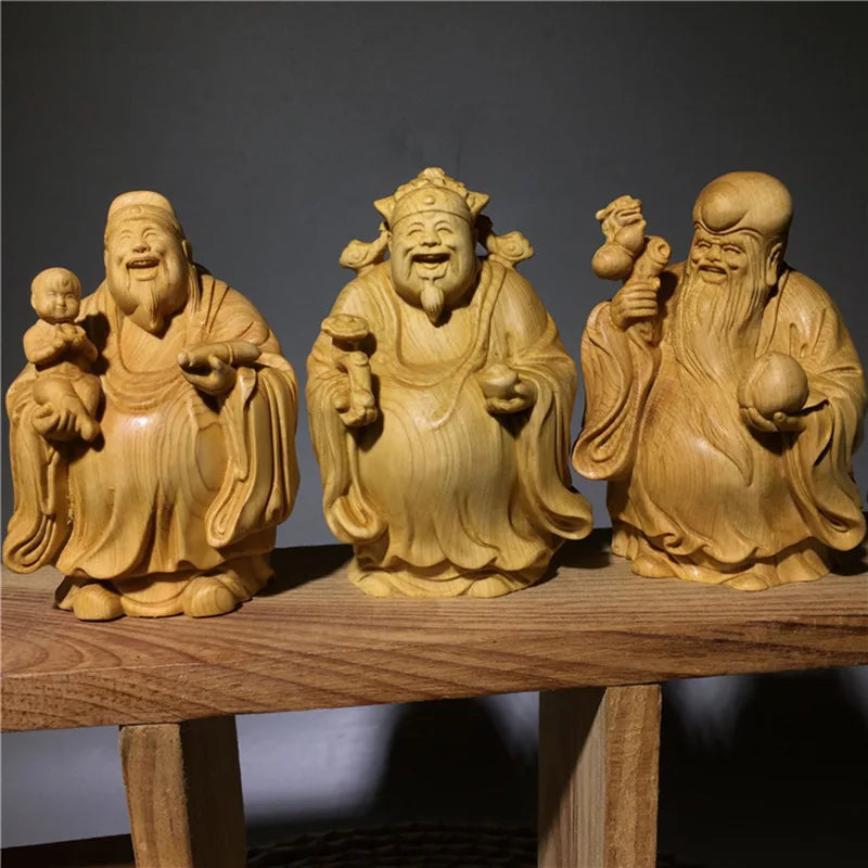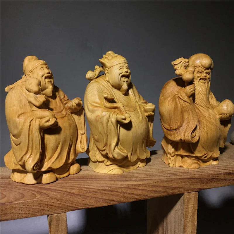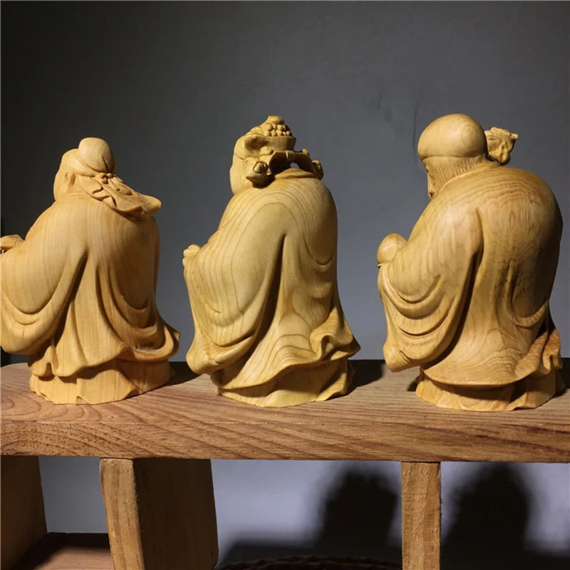 Invite luck, wealth, and long life into your home — display the Fu Lu Shou 3-piece wooden statue set today!