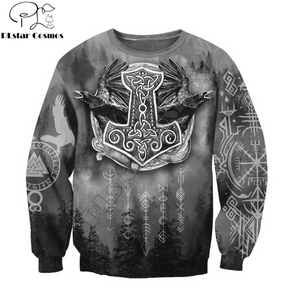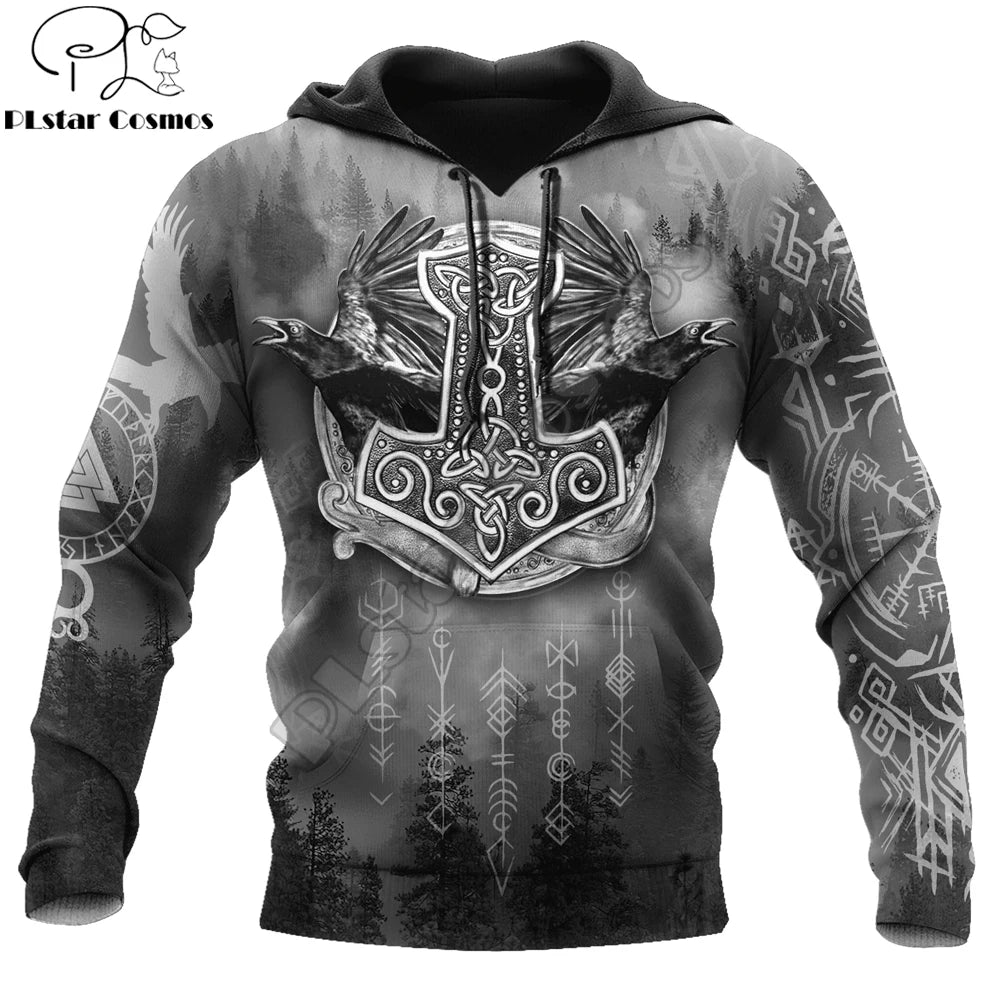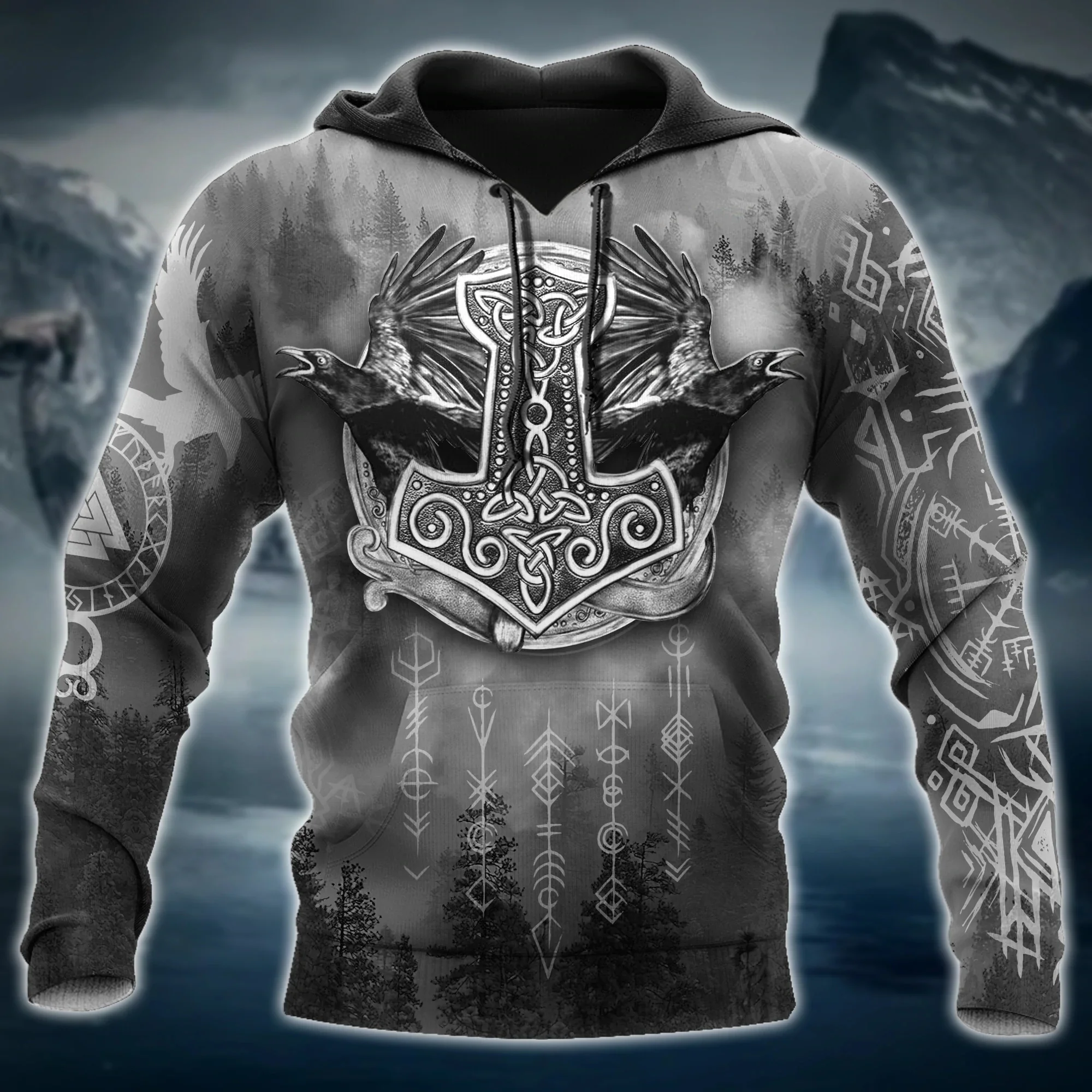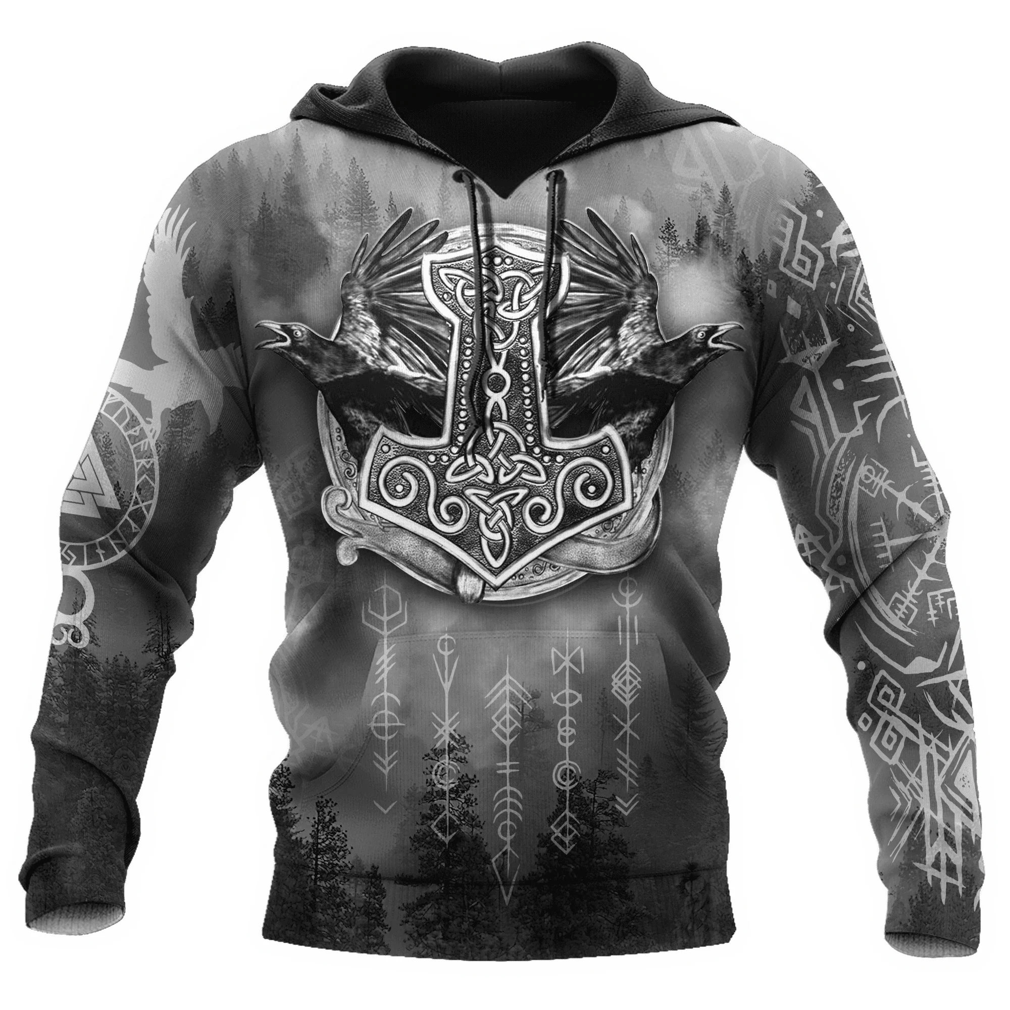 Channel the strength of Norse mythology with this bold 3D all-over printed hoodie featuring the Hammer Mjolnir, Odin, and raven tattoo designs — perfect for casual wear and sporty street style.