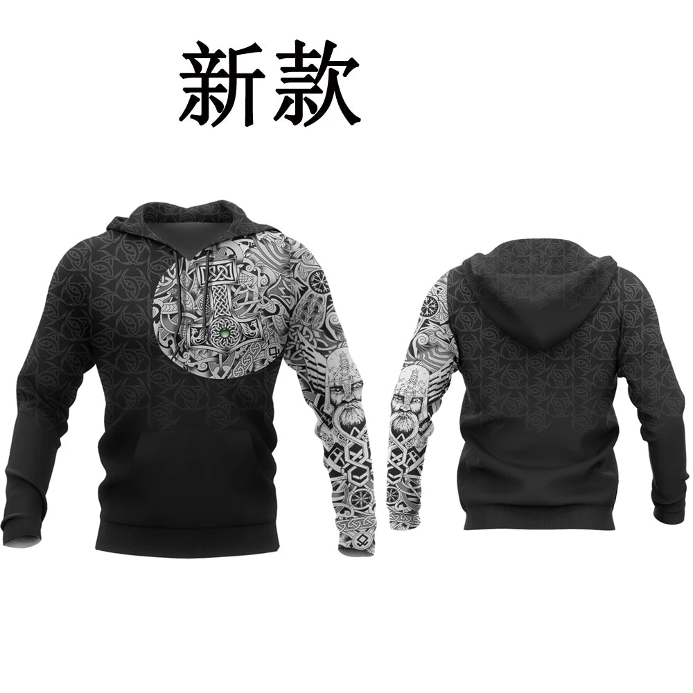 Fuse Norse mythology with edgy street style in this 3D printed hoodie featuring Mjolnir, Odin, and raven tattoo art — a must-have for Harajuku fashion lovers this autumn.