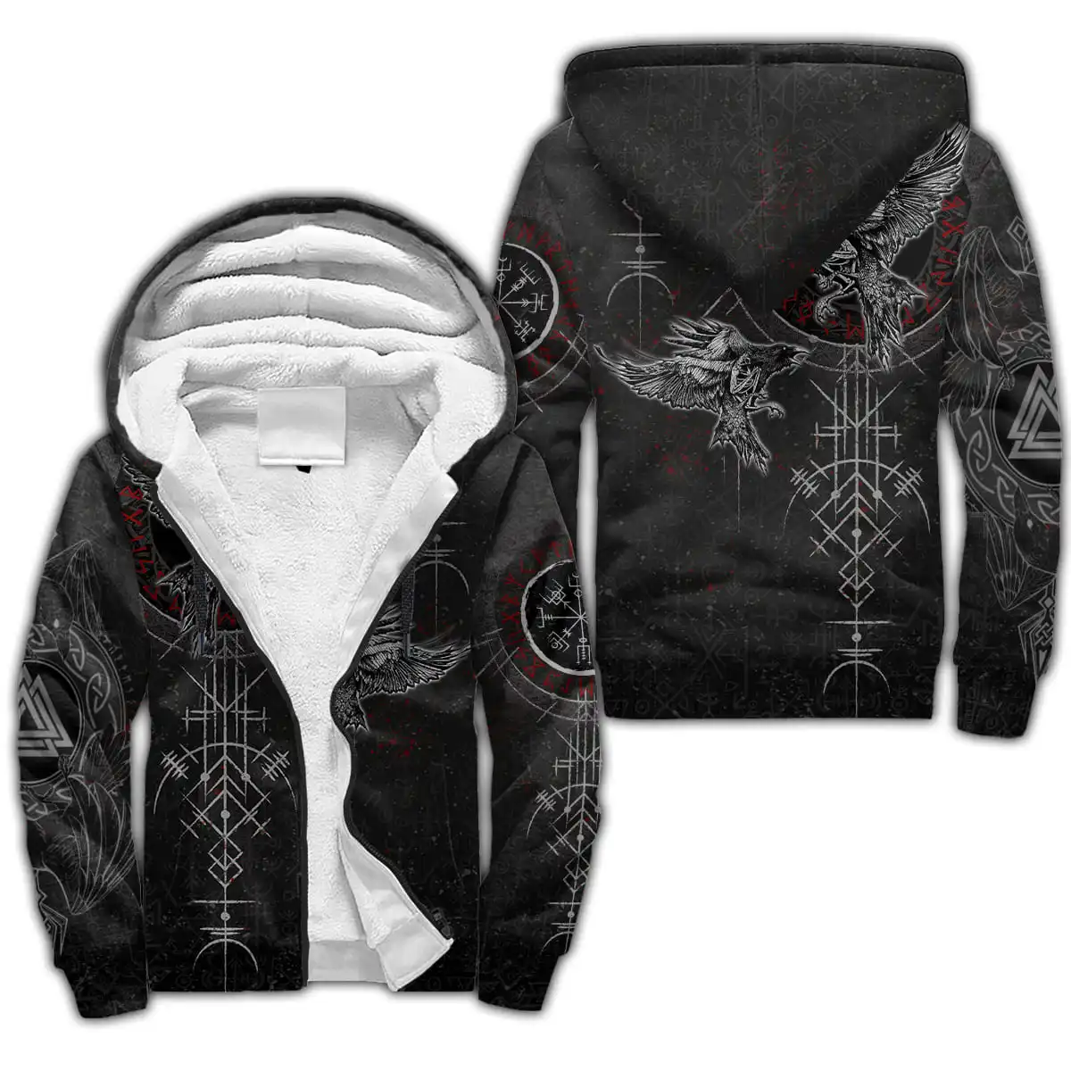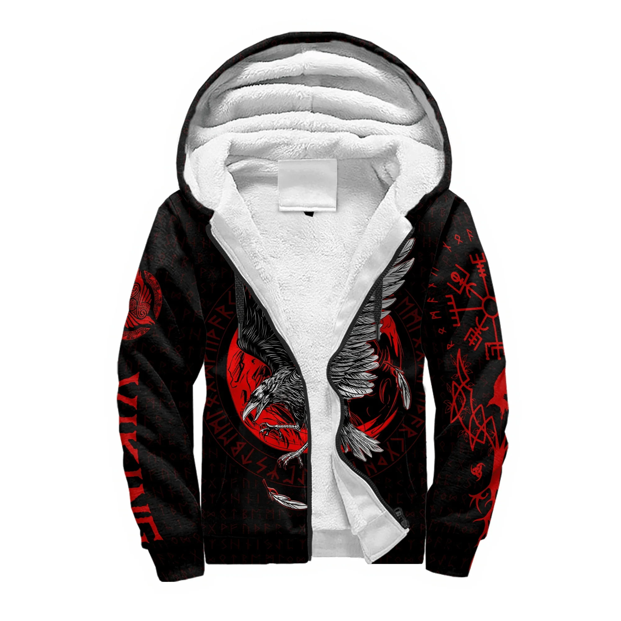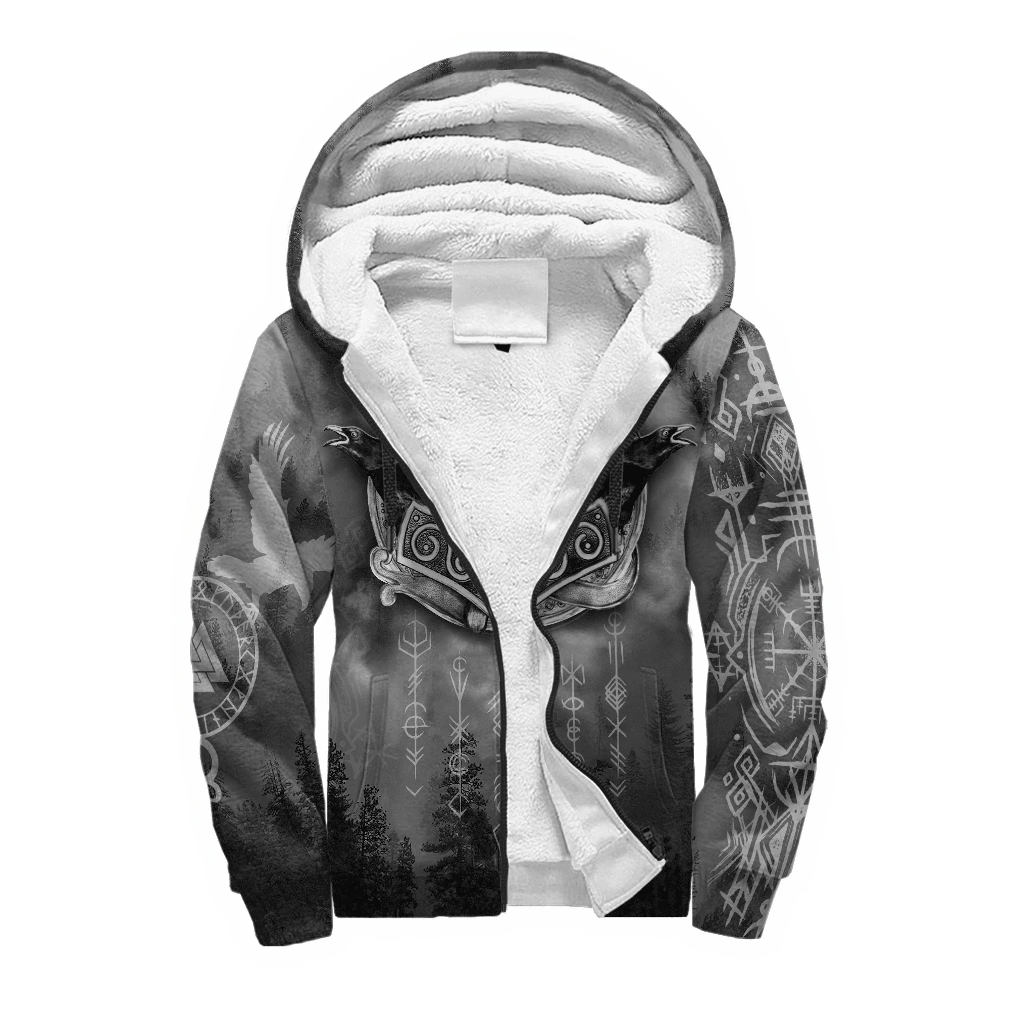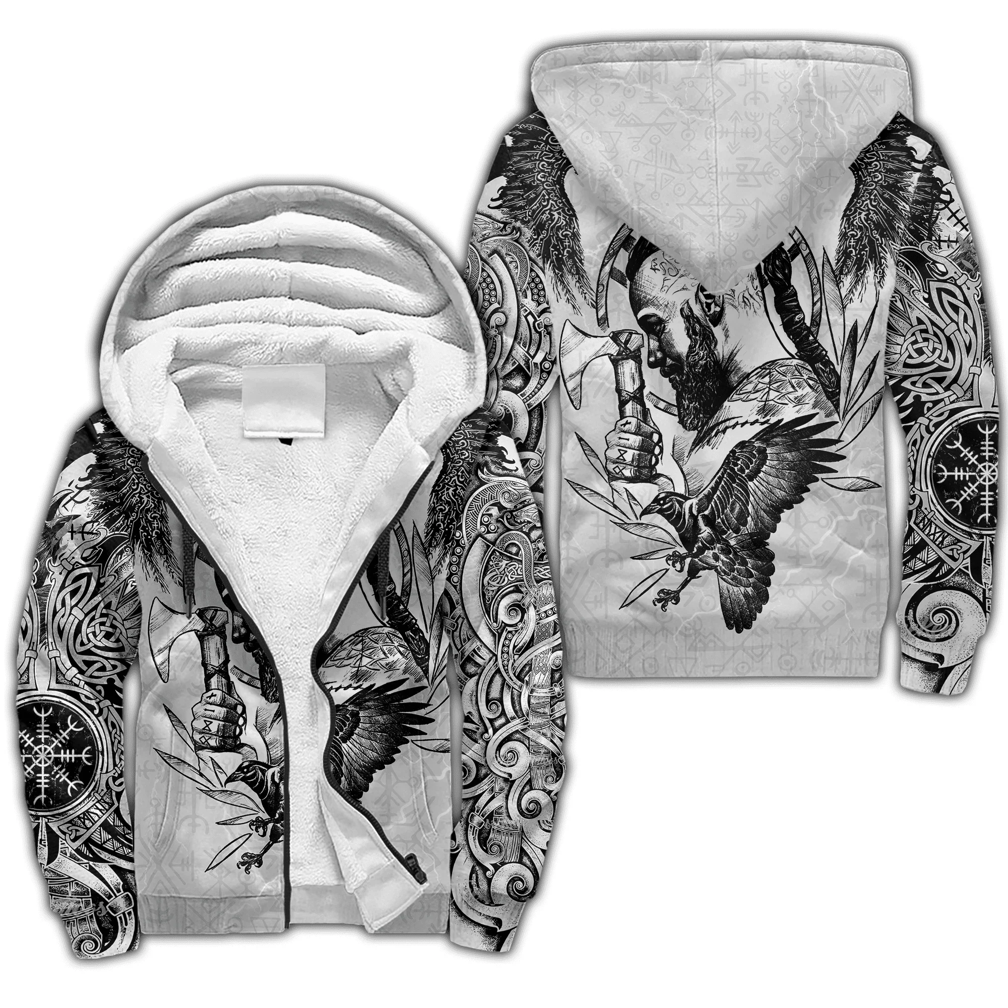 Mjolnir Odin Raven Tattoo 3D Printed Winter Zip Hoodie – Unisex Warm Fleece Tracksuit Jacket