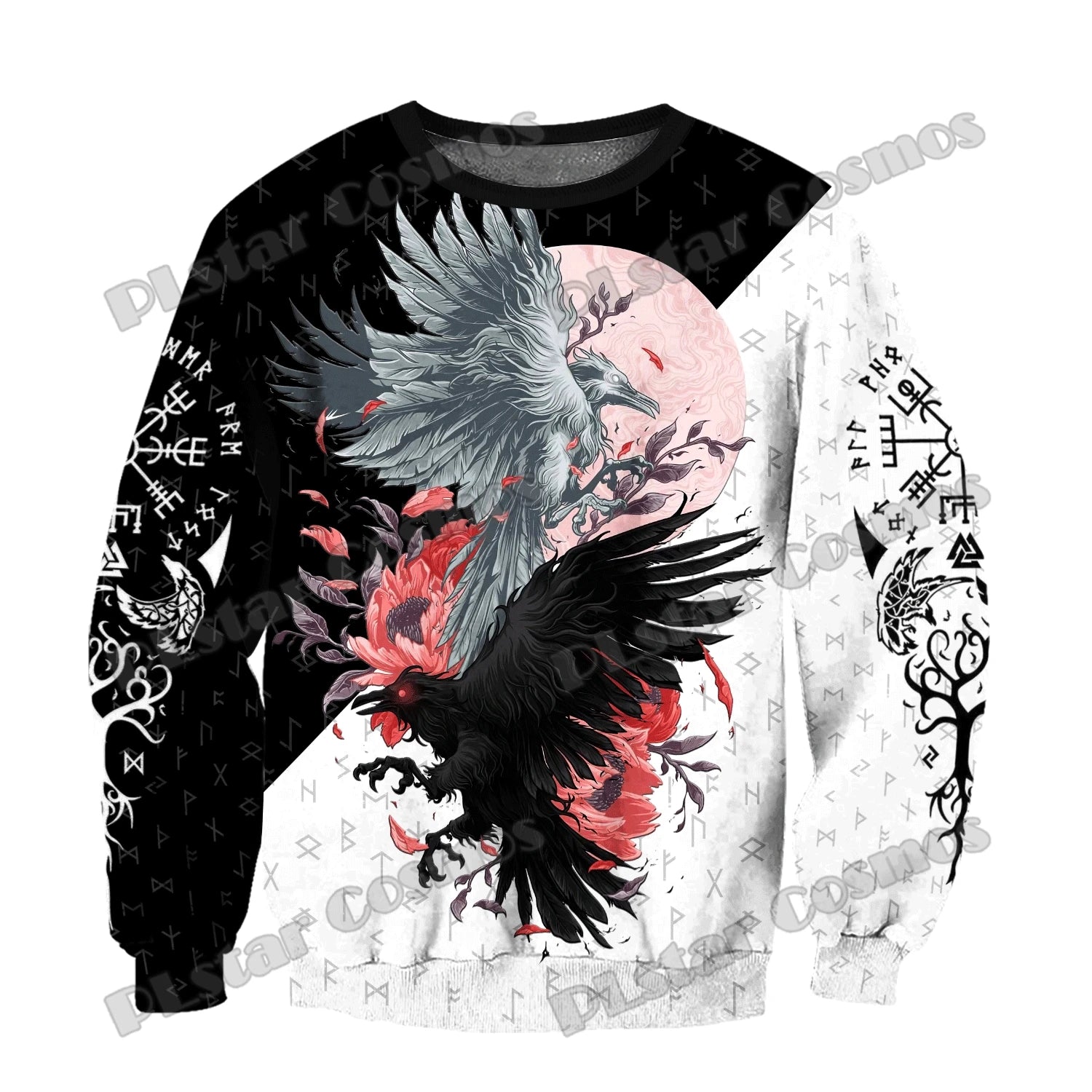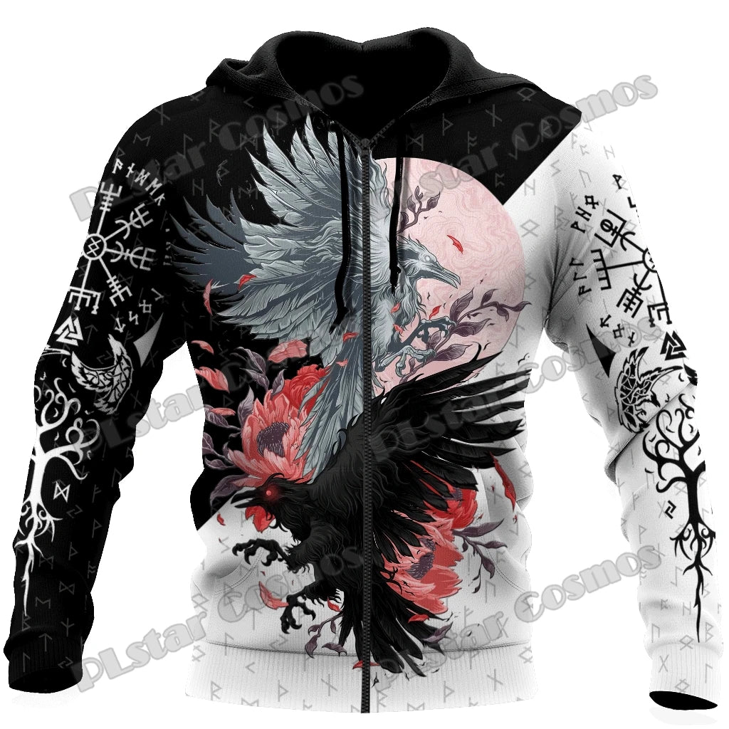 Raven Tattoo Vegvisir Runes 3D Printed Hoodie – Unisex Autumn Streetwear Zip-Up
