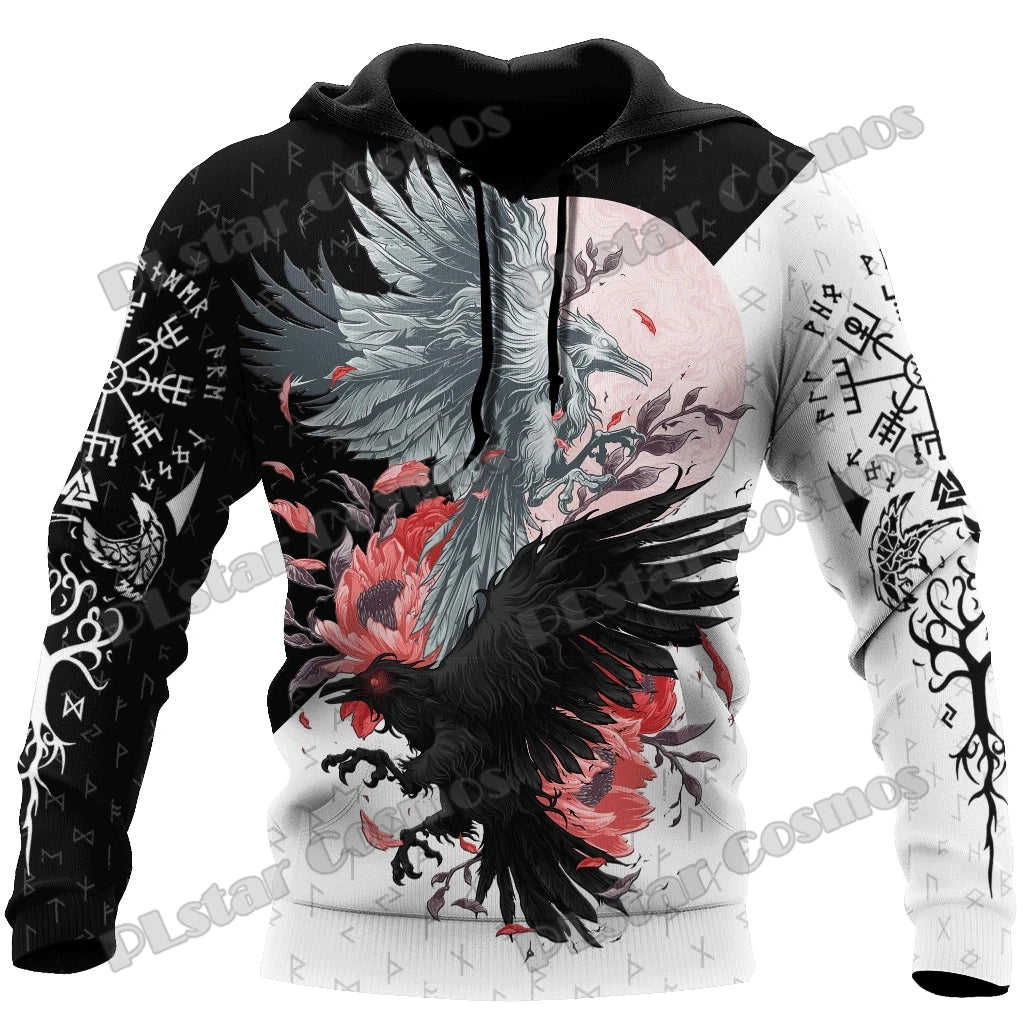 Merge Norse symbolism with modern streetwear in this 3D printed hoodie featuring raven tattoos, Vegvisir, and runes — perfect for casual autumn wear.
