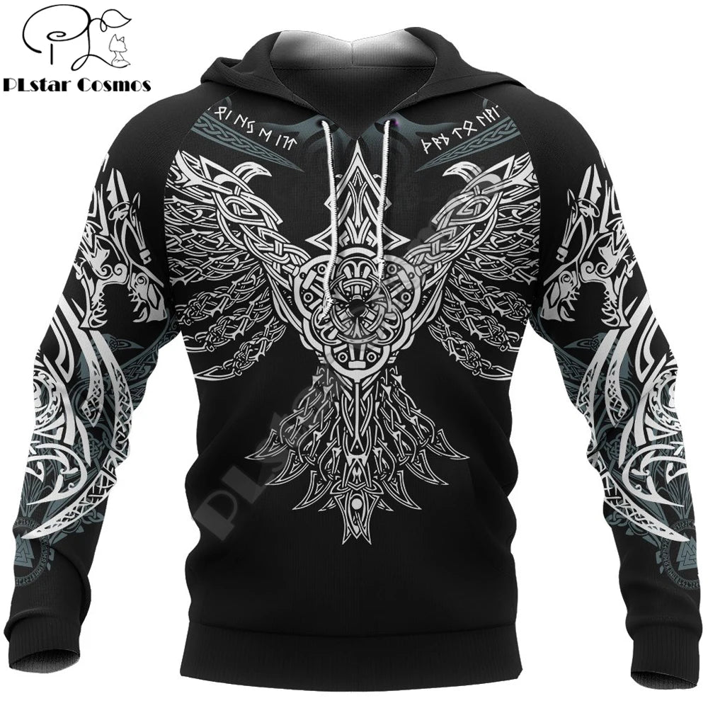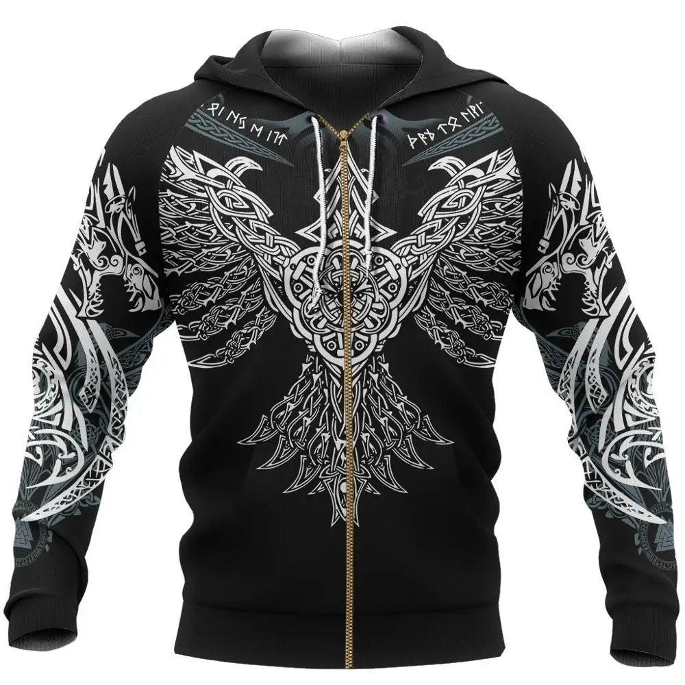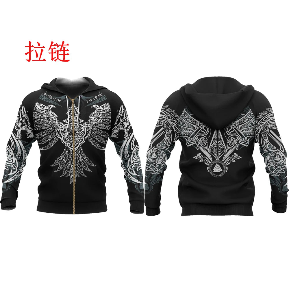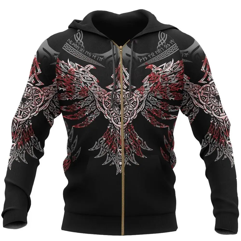 Tattoo Pullover Hoodie Raven of Odin 3D Printed – Men’s Zip-Up Hoodie, Harajuku Streetwear