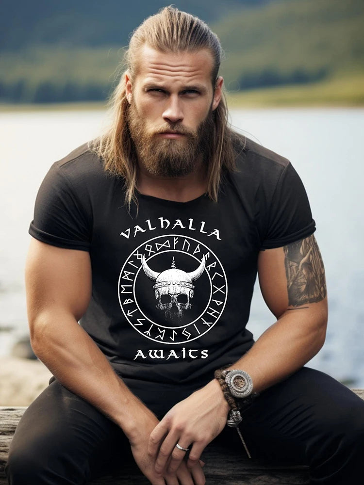 Valhalla Awaits Viking T-Shirt – Norse Mythology Summer Outdoor Casual Men’s Short Sleeve Street Fashion Top