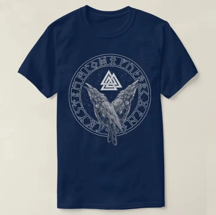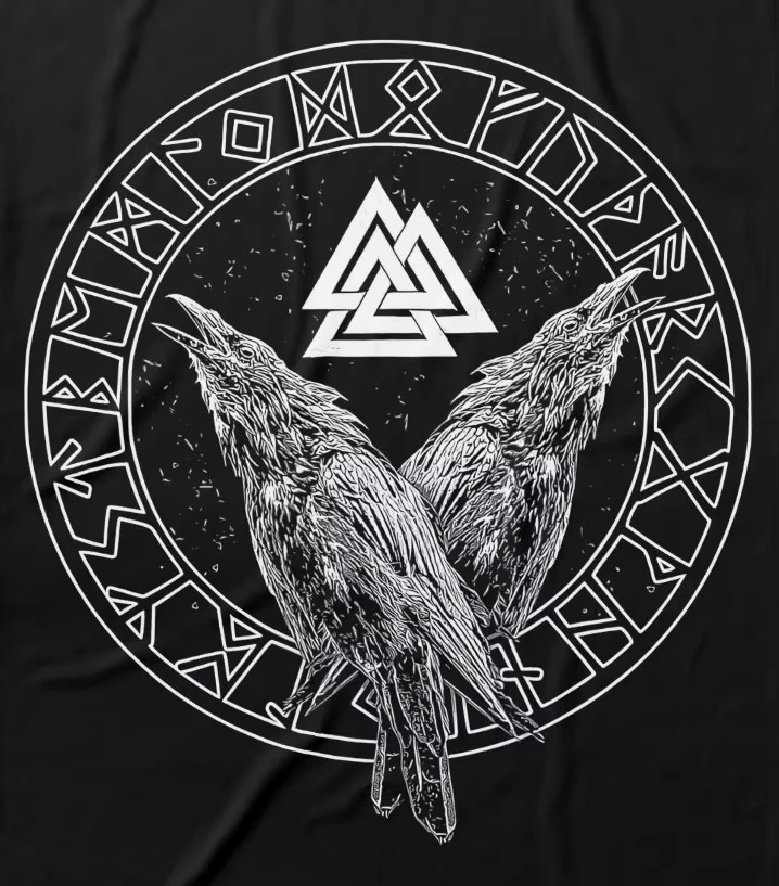 Detailed print showcasing Valknut rune and Odin’s ravens Hugin and Munin