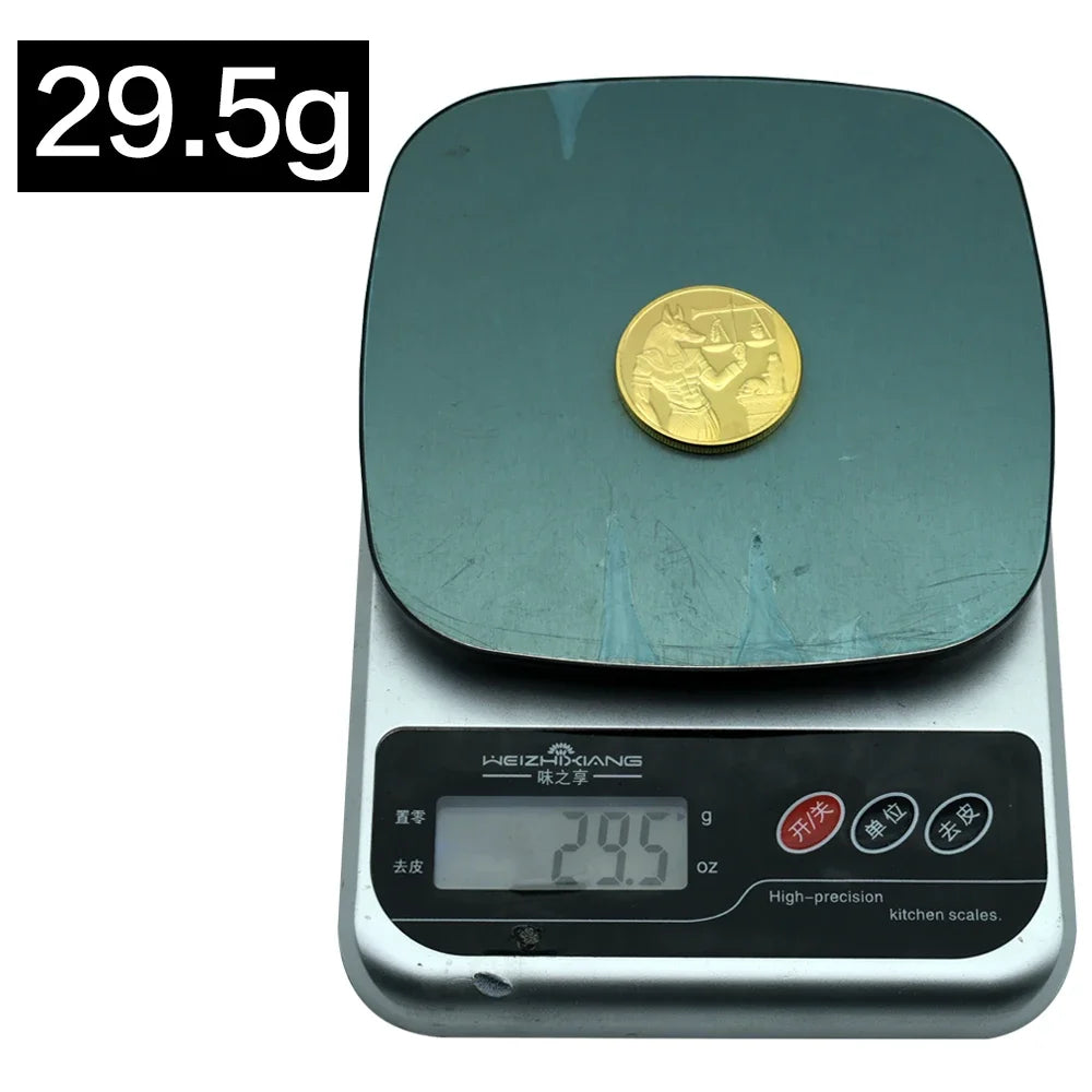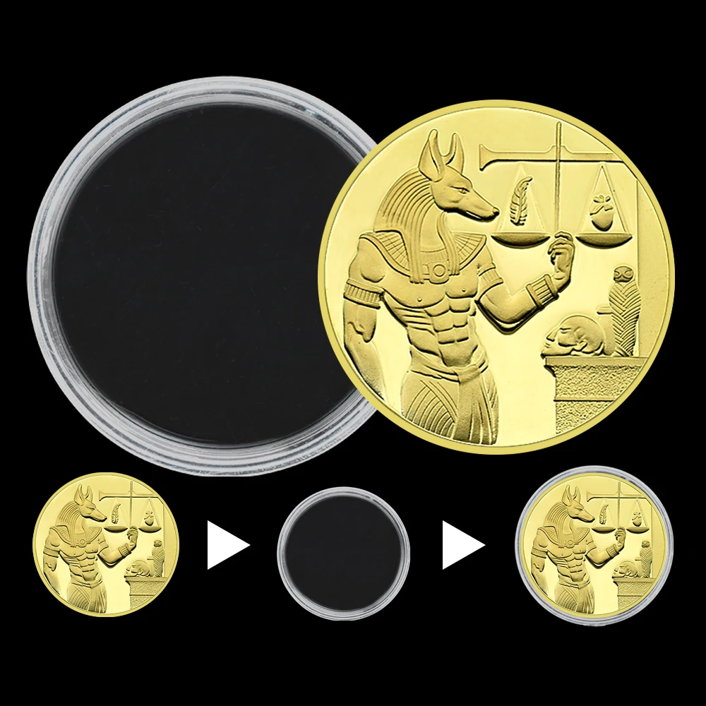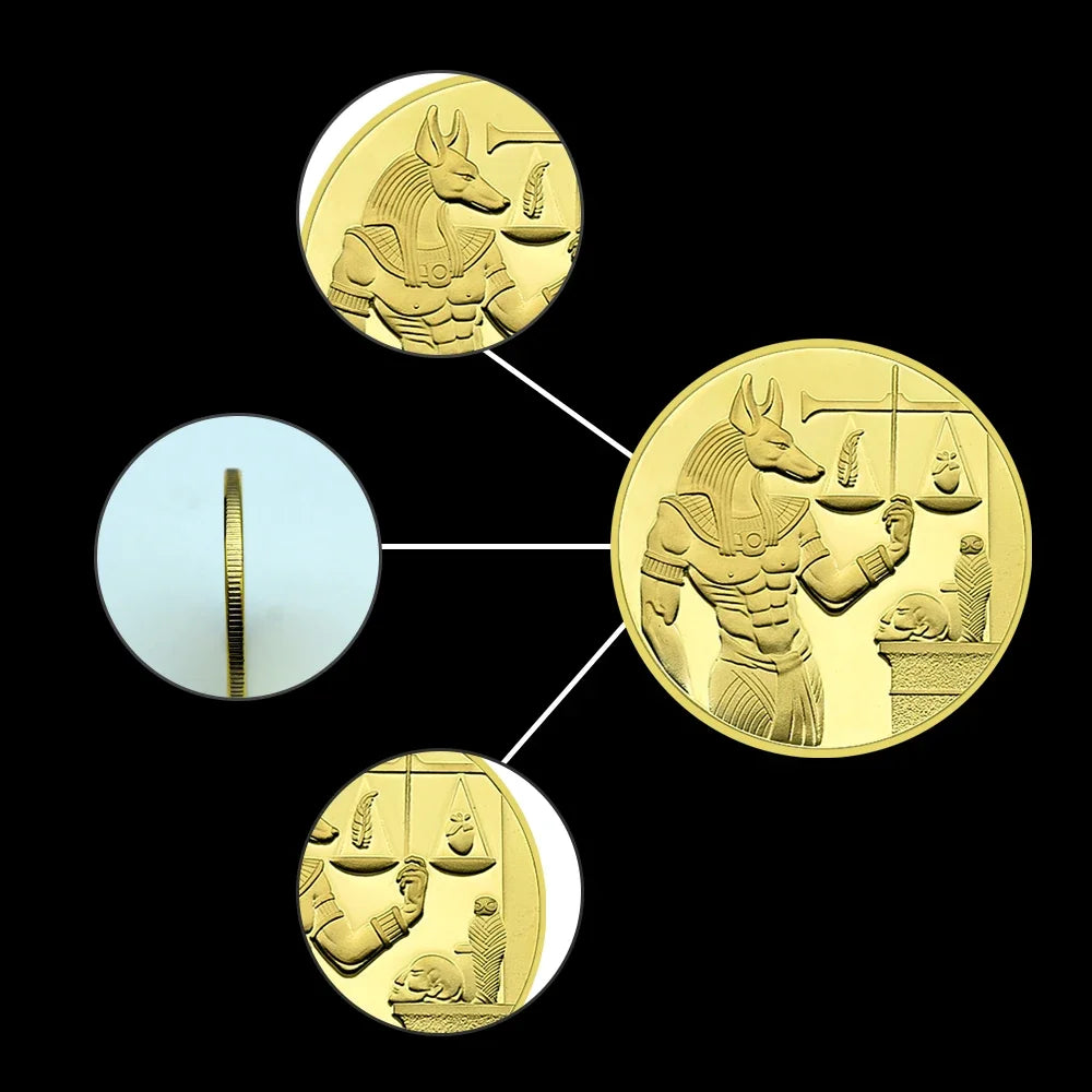 Set includes 3 unique coins with designs featuring Anubis, Pyramids, and hieroglyphic symbols