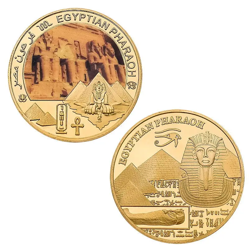 Reverse includes pyramids, scarabs, or ancient script representing Egyptian culture