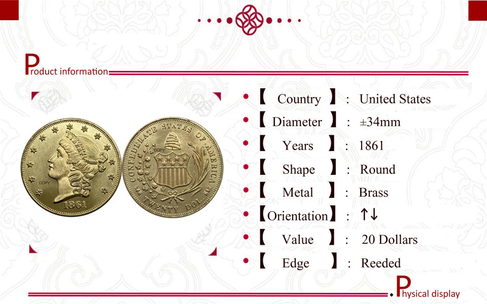 1861 Confederate States of America Double Eagle Coin – Replica $20 Gold Coin Collectible