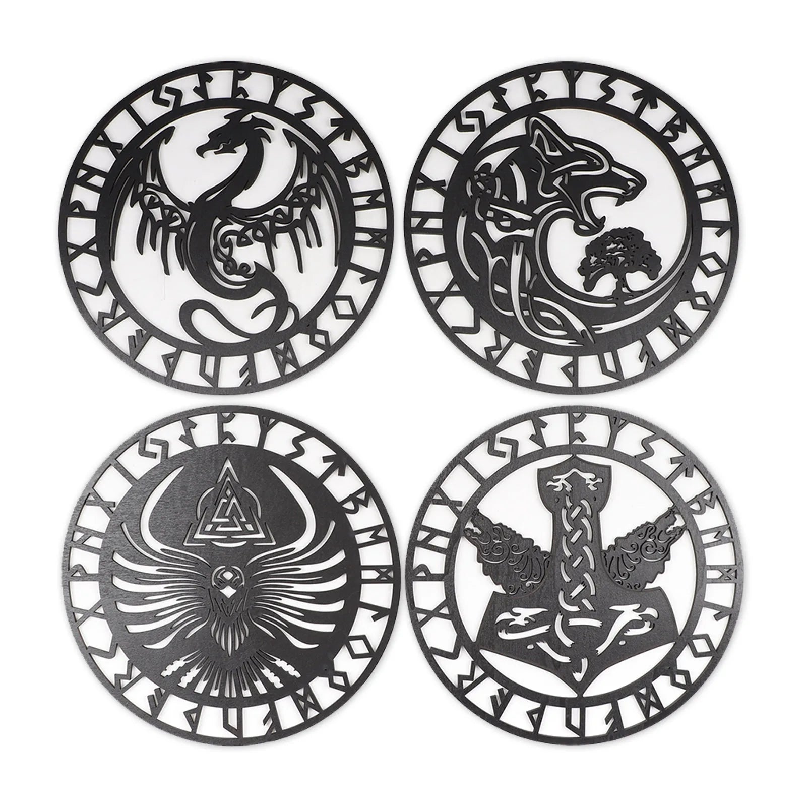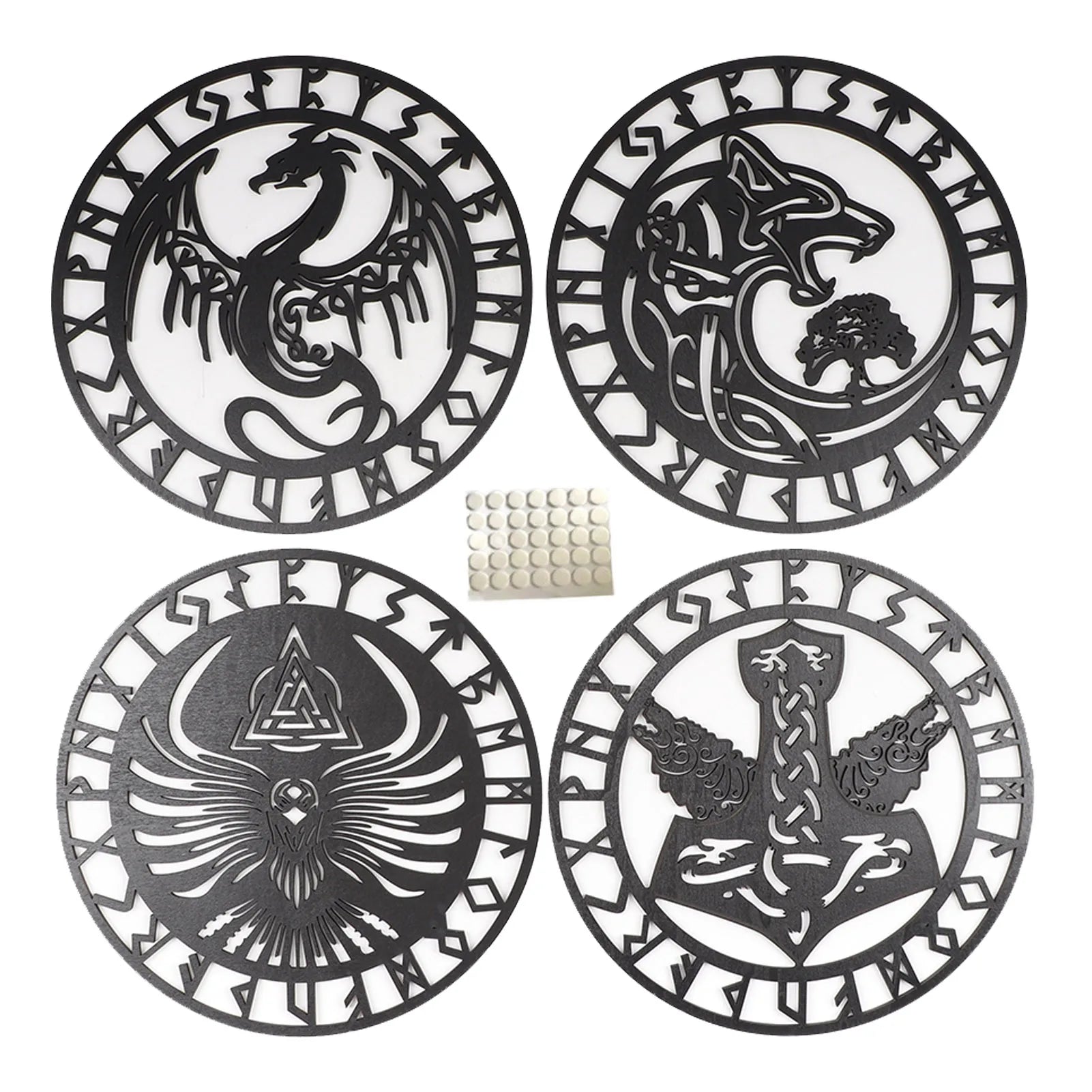 4-Piece Viking Wooden Wall Art Set – Nordic Rune Amulet Signs for Home, Office, or Men’s Room Decor