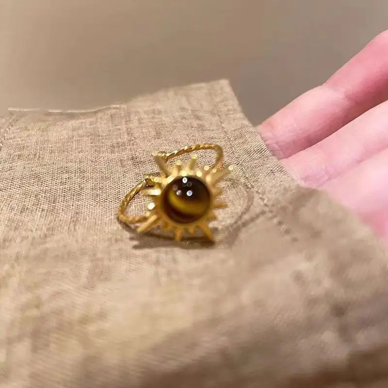 Lucky Vintage Brown Tiger Eye Stone Open Ring for Women – Sun Design in Gold Color